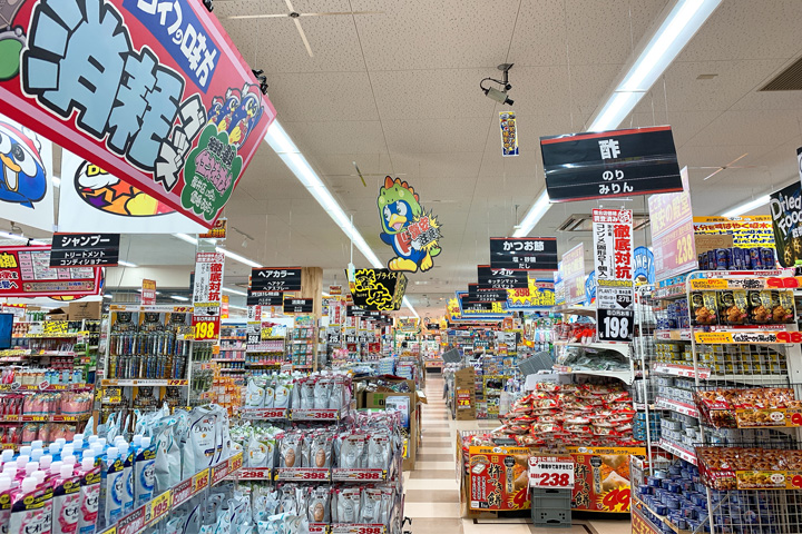 1階は食品・日用消耗品が中心になっていて、2階はコスメ・スマホ用品・おもちゃ等が販売されています。