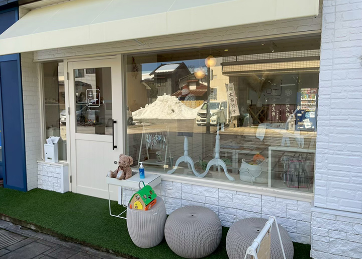 真っ白な外観が目印で、くまのぬいぐるみが置かれていたり、店先から可愛らしい雰囲気が漂っています♪