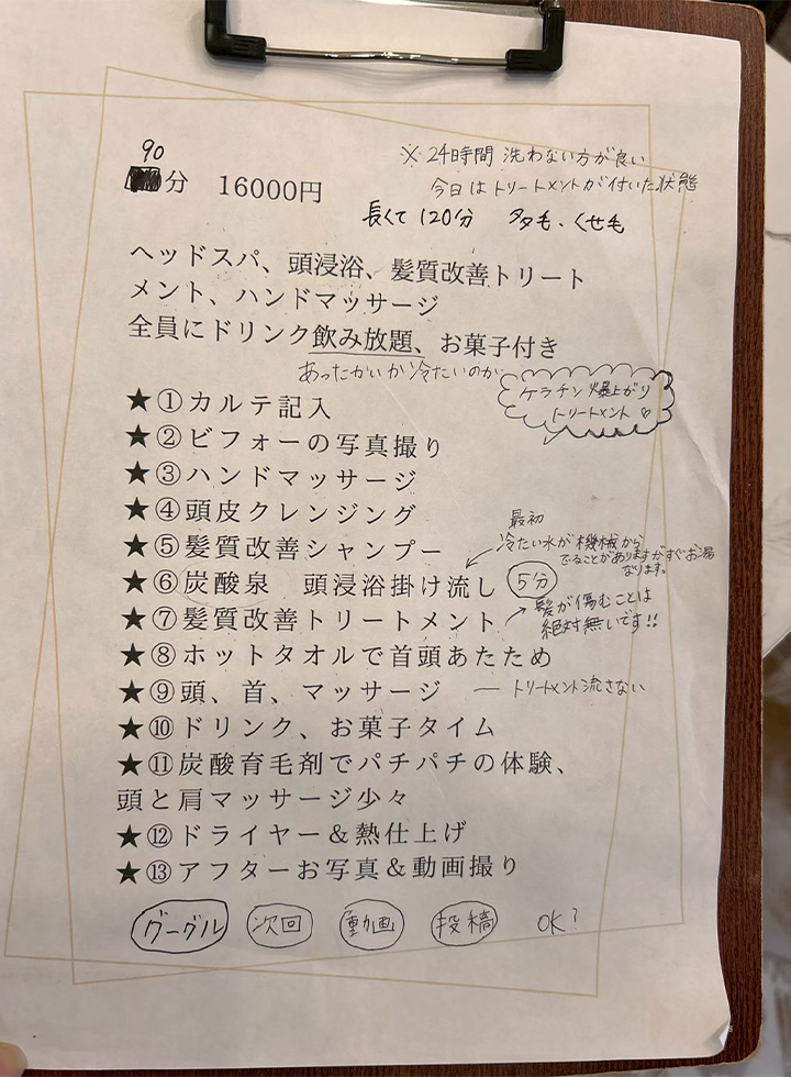 90分で16,000円で、頭皮クレンジングに頭浸浴、シャンプートリートメントなどの髪質改善プログラムだけでなく、各種マッサージ、炭酸育毛剤の体験、さらにドリンクとお菓子までついたスペシャルコースでした。