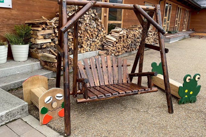 建物の前には木製のブランコや動物たちがお出迎え☆