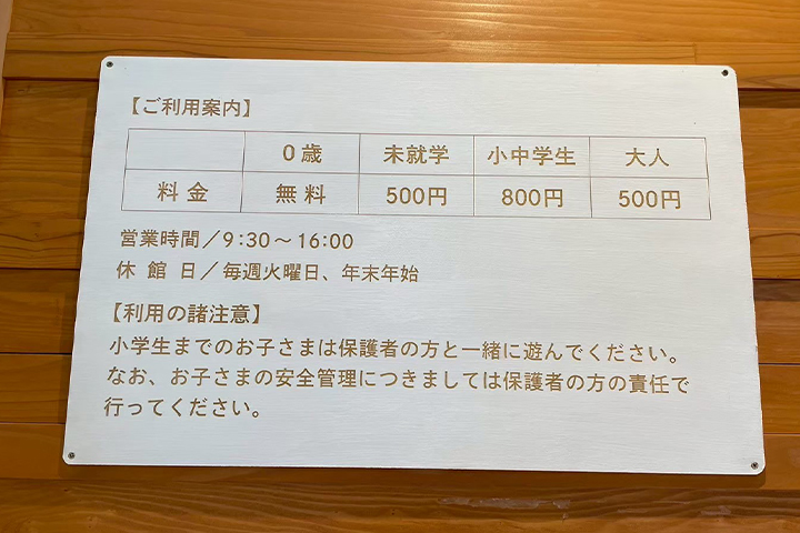 入館料は0歳児無料、未就学児500円、小中学生800円、大人500円とリーズナブル。