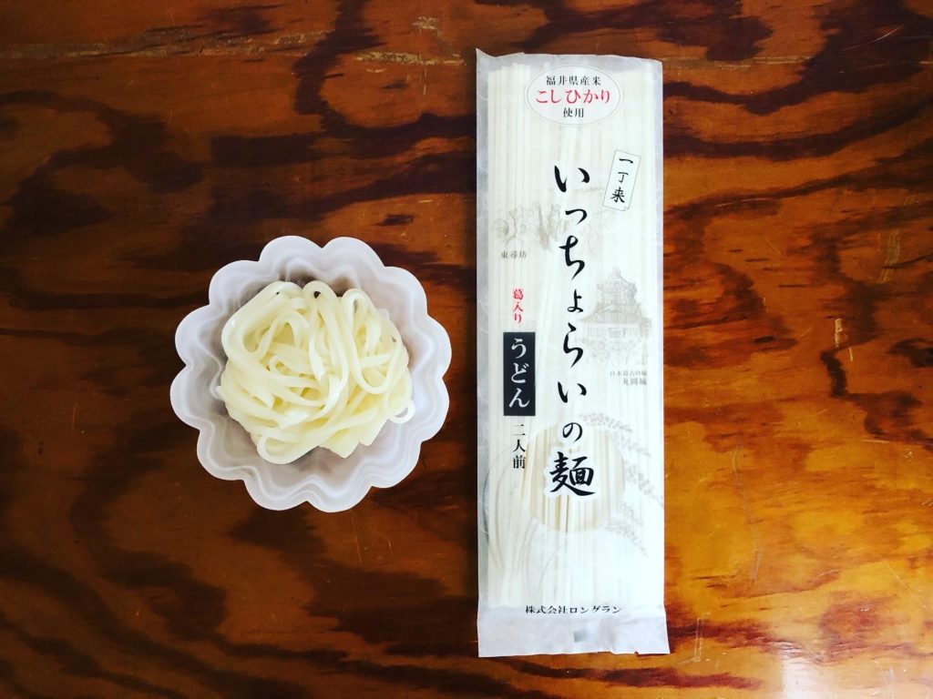 ついつい手に取りよく見てみると「福井県産米こしひかり」入りのうどんとのこと!