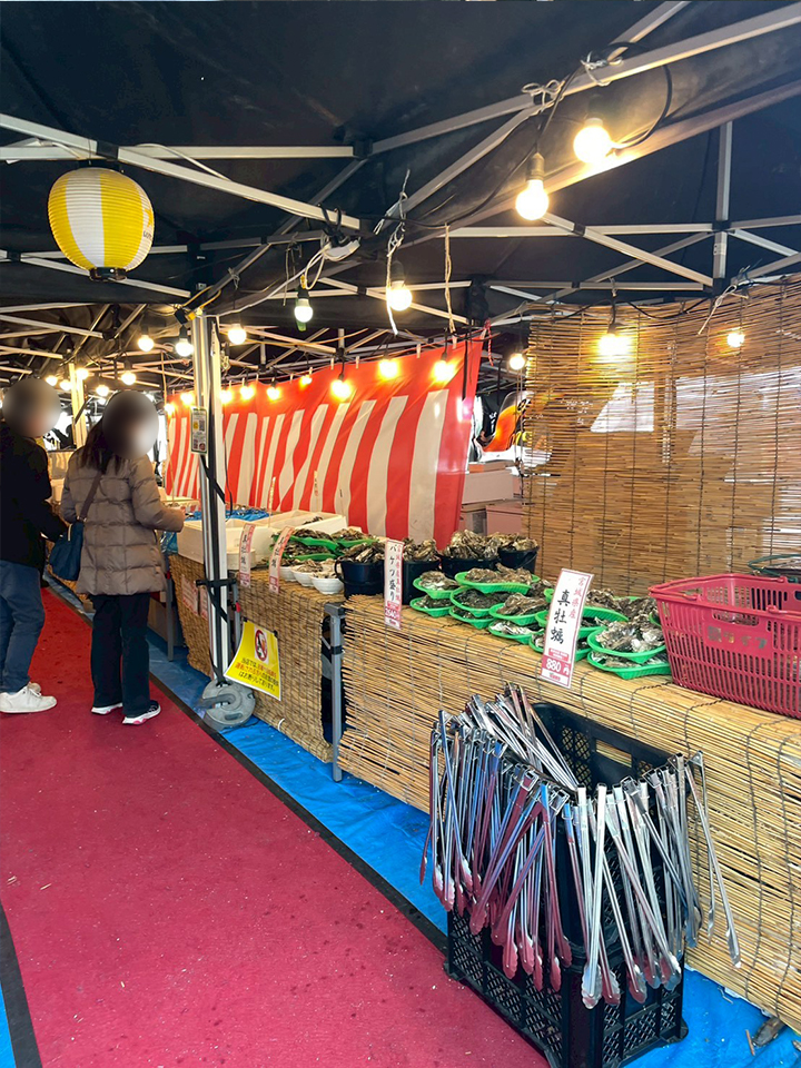 会場には特設テントが設置され、炭火コンロが並ぶ“出張カキ小屋”スタイルになっています。
