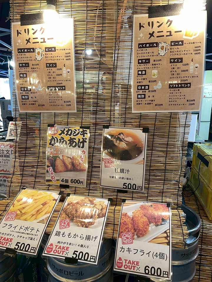 牛串やフランクフルト、ポテトなどの軽食やアルコール・ソフトドリンクもあり、家族でも楽しめる内容になっています!