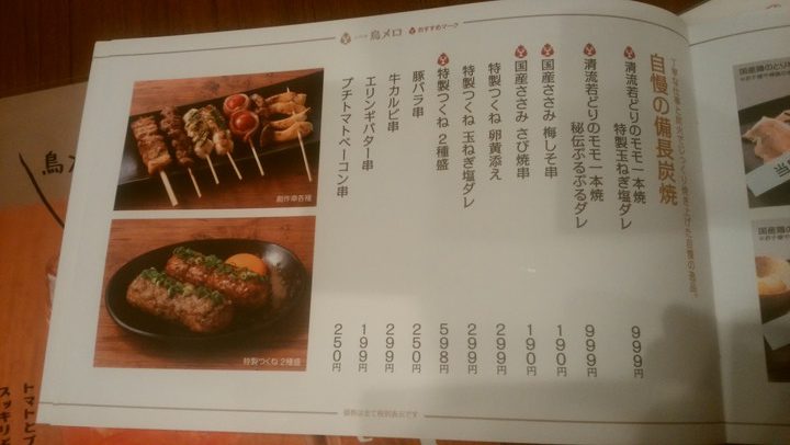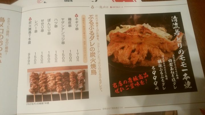 炭火焼き鳥7本盛り合わせや若鳥のもも一本焼きなどのメニューが並びます。