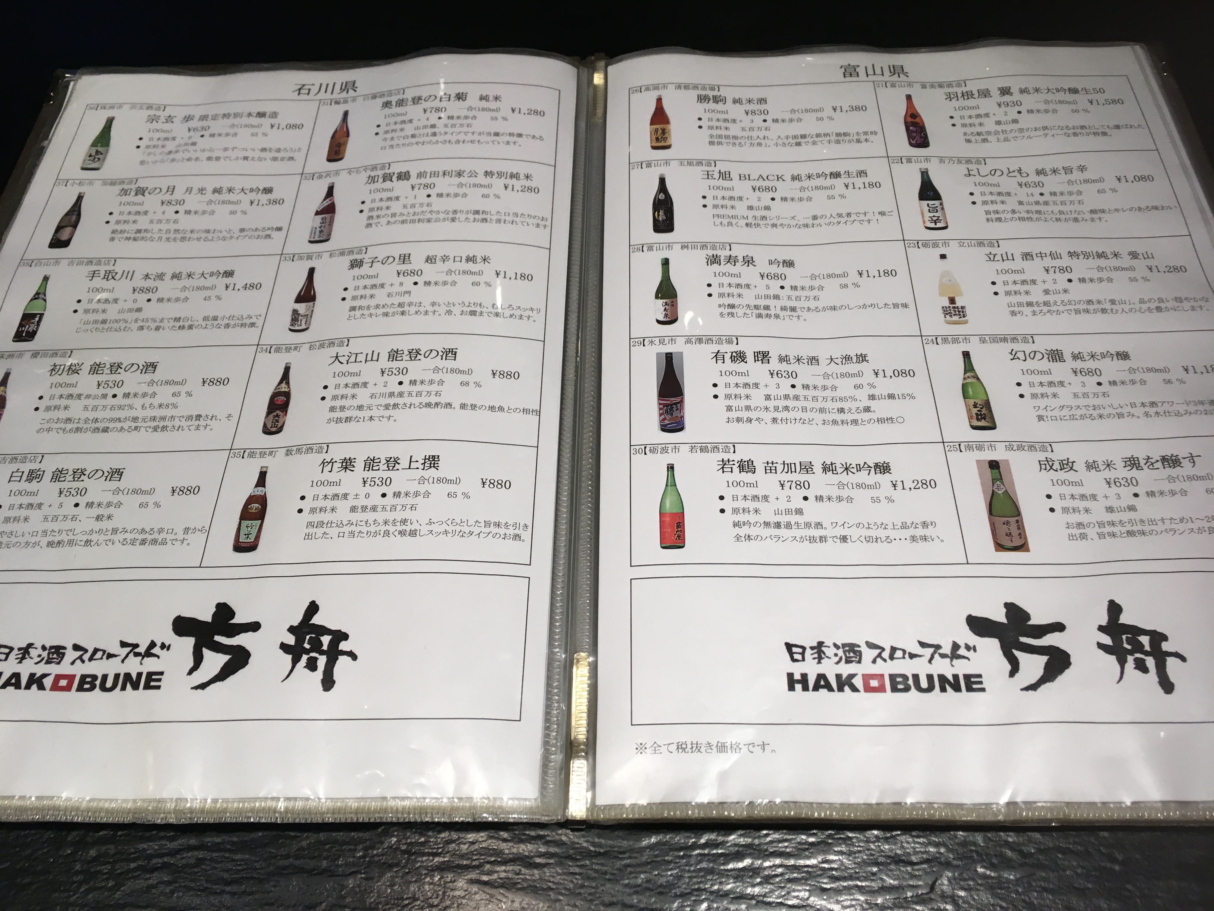 メニュー表を開くと、福井、石川、富山などなど、県別におすすめの日本酒の詳細が書かれています。