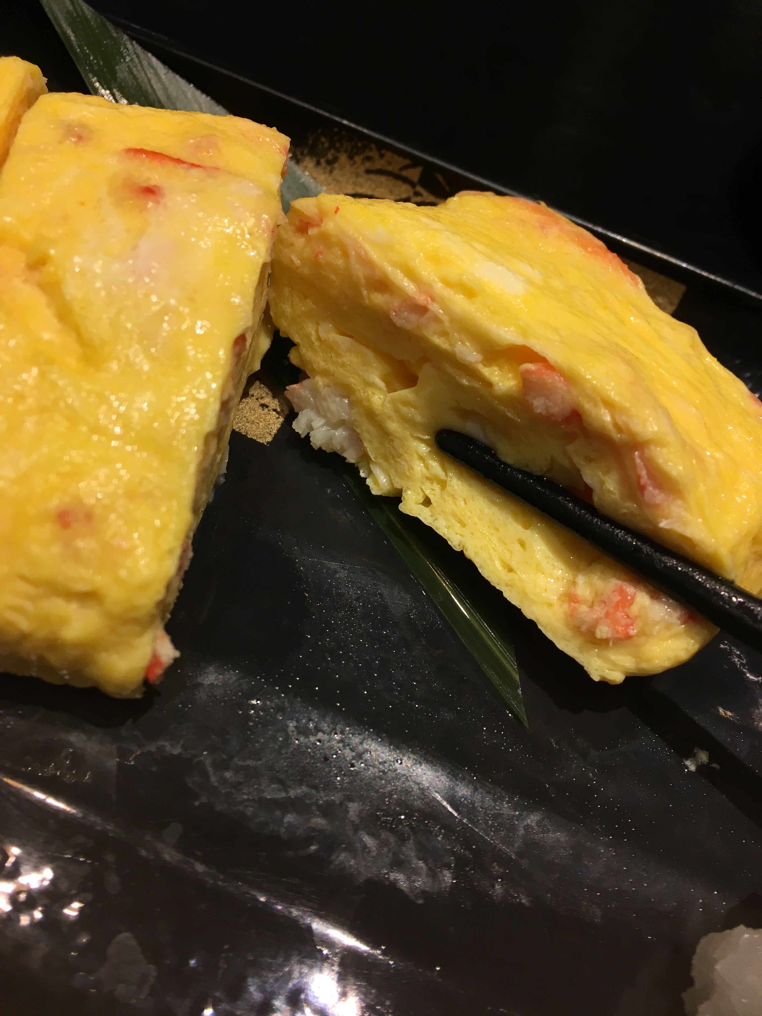 だし巻き卵は、福井県産の地鶏卵を使用し、蟹身との相性ばっちりでした。