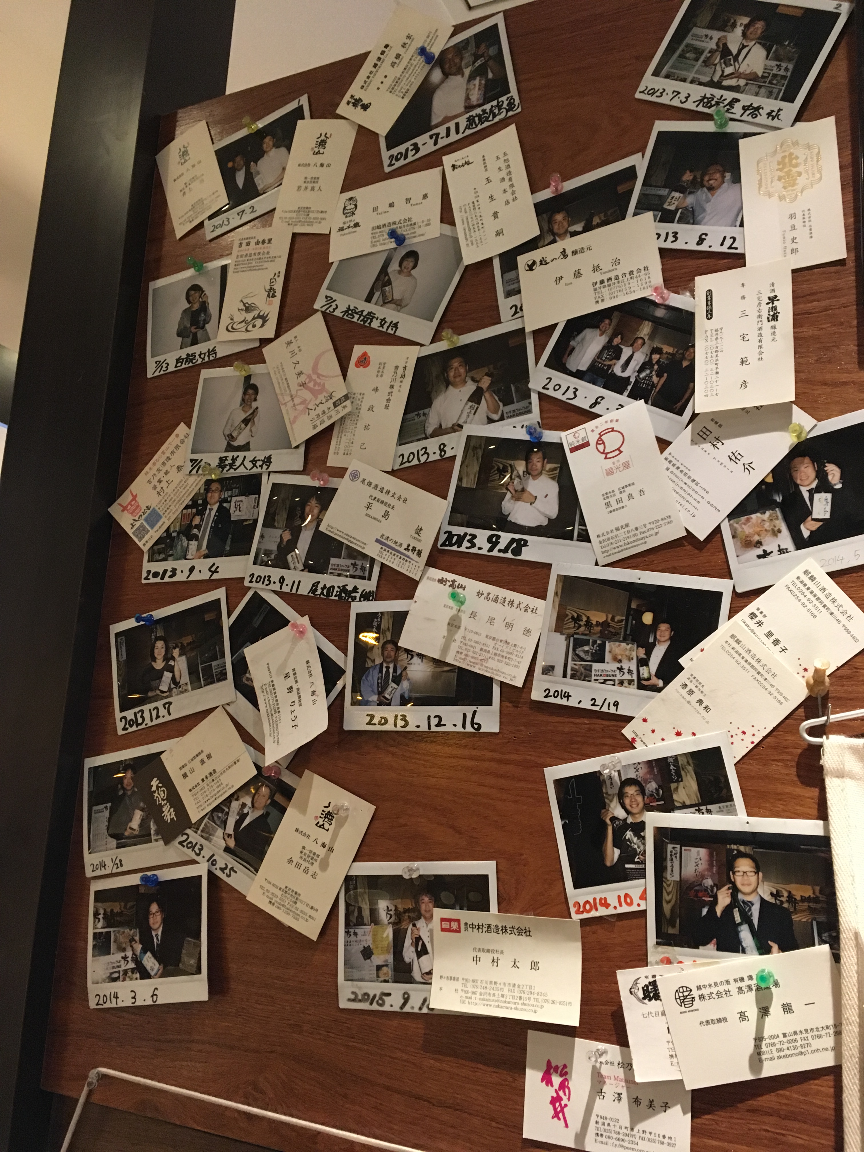 お会計の時に壁を見ると、びっしりと蔵元さんの名刺やブランド大使の名前も…!