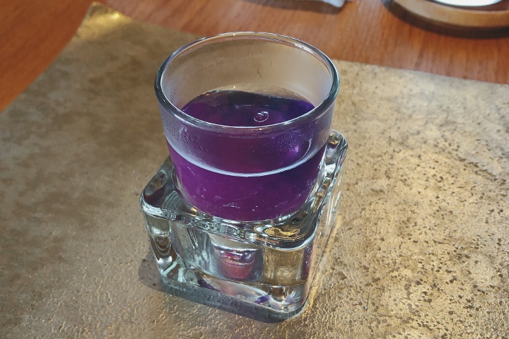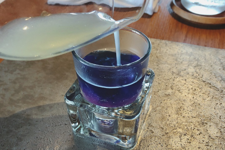 青色のレモン汁を入れると紫に見た目が変化するおしゃれな紅茶です!