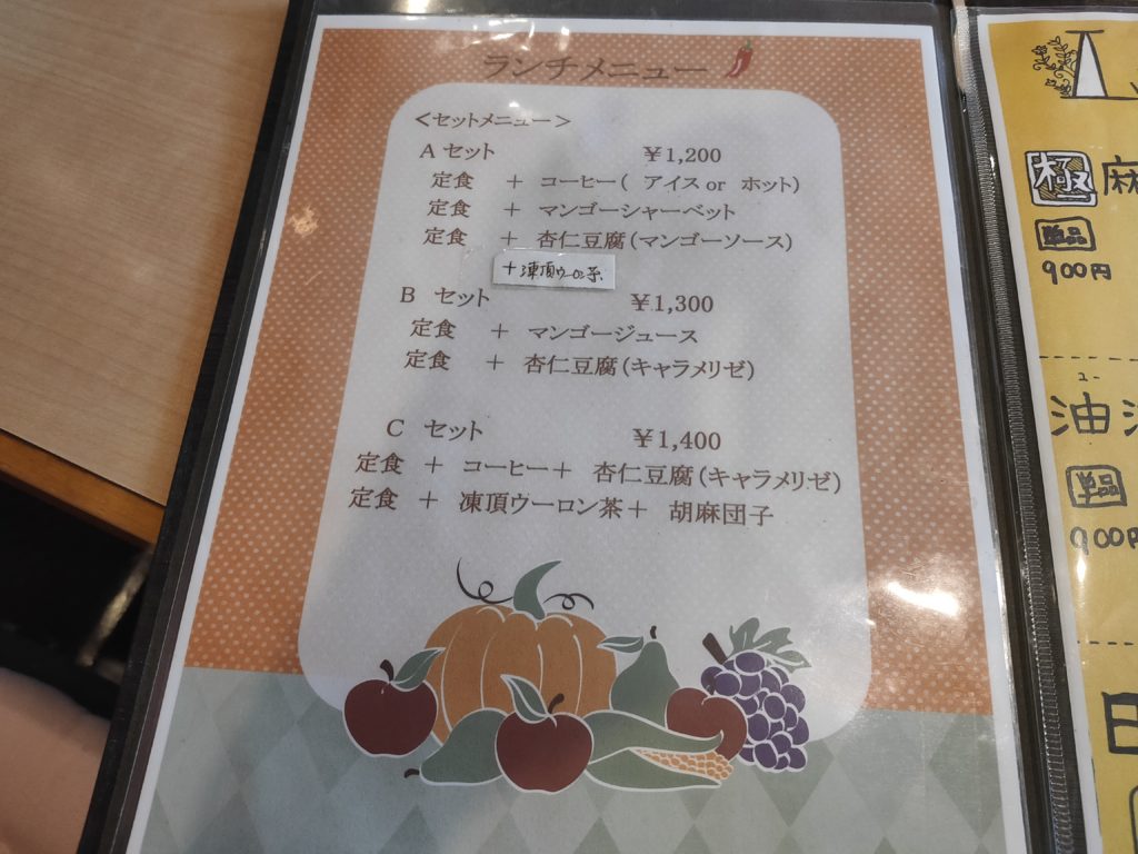 その他、海老チリ玉子、麻婆豆腐、油淋鶏、担々麺定食が並んでいます。(炒飯セットとかないのがすごくレアな気がします)