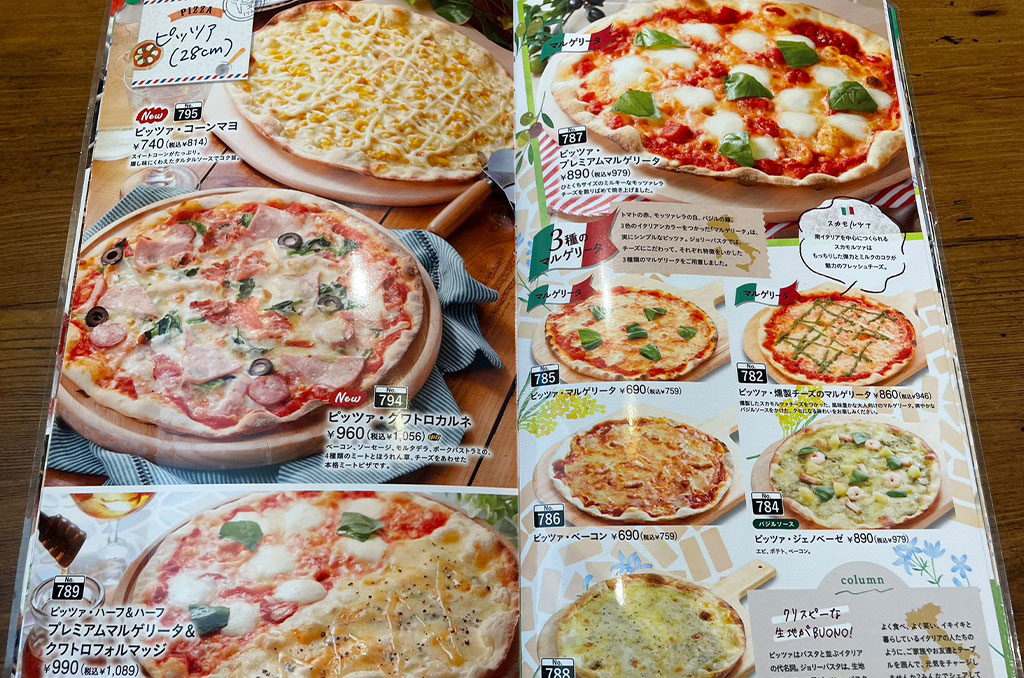 パスタは種類がたくさんあるため迷ってしまいますが、トマトソースやクリームソースなど味ごとに分かれているので、気分にあったパスタが見つかりそう♪季節限定のパスタフェアでは、富山県産白えびを使用した冷製パスタも。その他直径28cmボリューム満点のピッツァやキッズメニューなど、家族連れに嬉しいメニューが盛りだくさん⭐