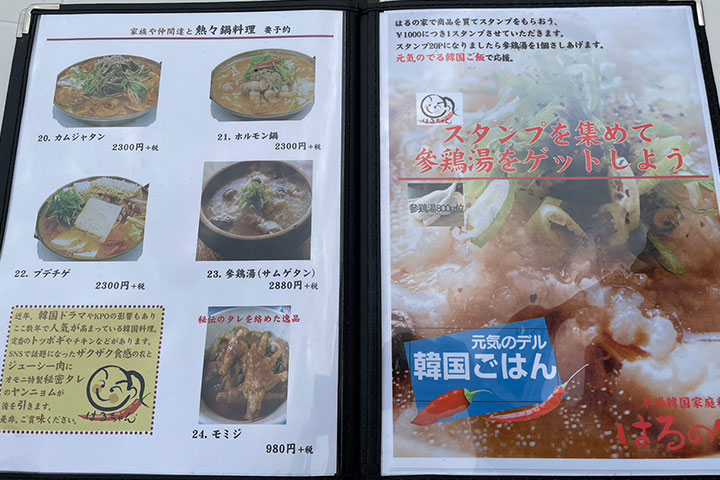 メニューはこんな感じ!ヤンニョムチキンやビビンパ、プルコギ、ユッケジャンなど、定番の韓国料理が勢揃い。