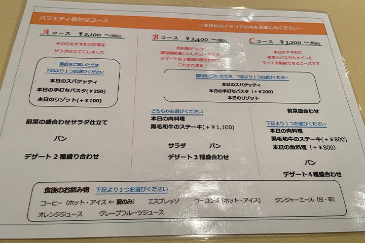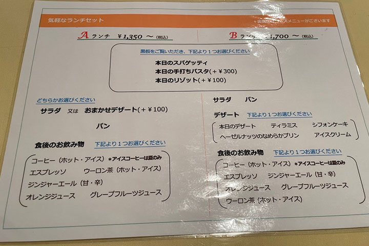 店内のホワイトボードにその日のパスタやリゾットが記載されています。
