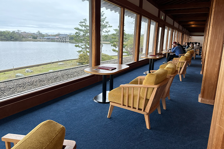 ソファー席からは北潟湖と鹿島の森の絶景が堪能できます(この日は残念ながら曇りでした🌥)