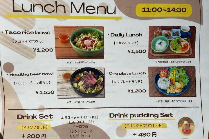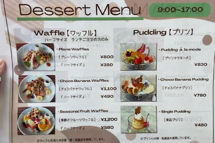 9:00〜11:00のお得なモーニングプレート(500円)、11:00〜14:00のランチメニュー、9:00〜17:00のデザートメニューがあります。