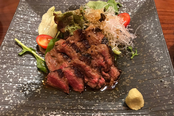 カプレーゼがチーズとトマトの味わいのハーモニーが完璧でジェノベーゼソースがとても引き立てていたのと、牛イチボ串がとても柔らかくて大絶賛!