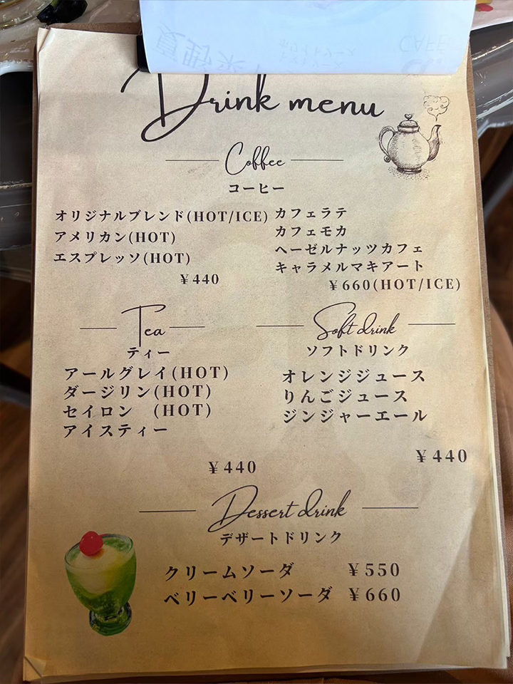 今回はアフタヌーンティー目的で来店したのですが、アフタヌーンティーについては紙ベースのメニュー表はなく、SNSや公式サイトでしかお知らせしていないようですね。