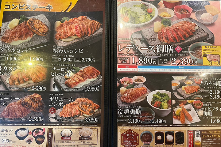 レディース御膳といった人気の御膳メニューの他、単品のステーキを選んでご飯セットをつけることもできます。