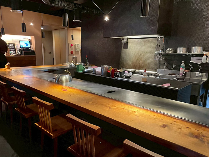 大きな鉄板が目の前にあるカウンター席や掘りごたつ席、個室席もあります。