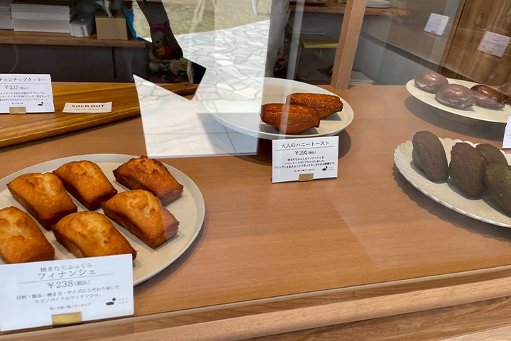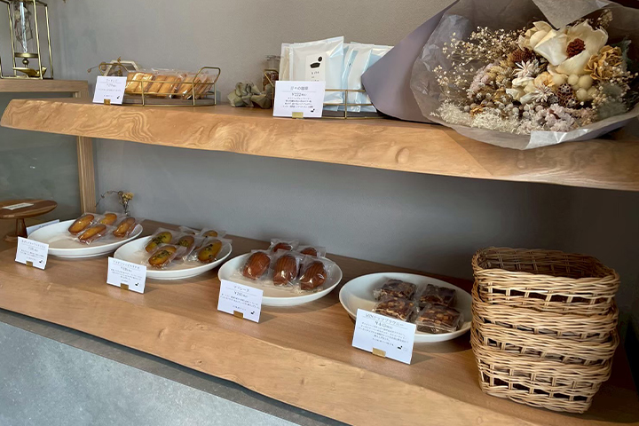 店内はナチュラルテイストで、焼きたての焼き菓子がずらりと並び、香ばしい香りが漂っています。