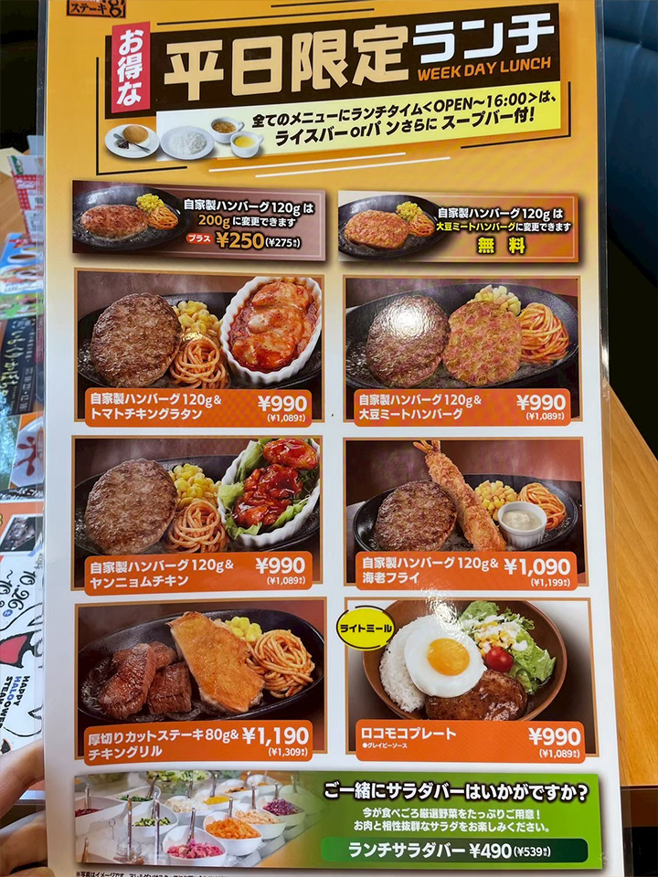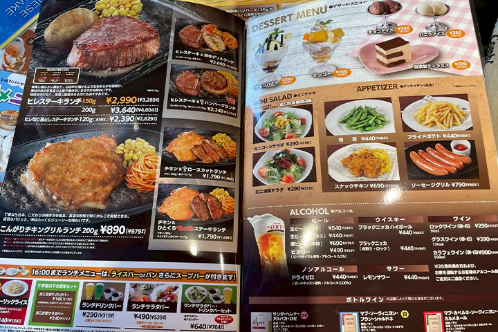メニューはステーキやハンバーグを中心に、セットやランチメニューが充実!