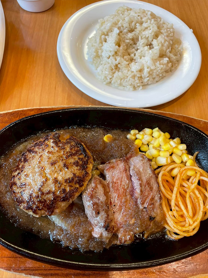今回は、『自家製ハンバーグ&サーロイン切り落としステーキランチ』に『宮のガーリックライス』をセットで注文しました!