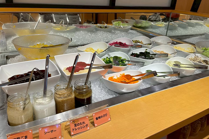 店内中央には種類豊富なドリンクバーやステーキ宮のこだわりサラダバーがあり、選べる楽しさがあります♪
