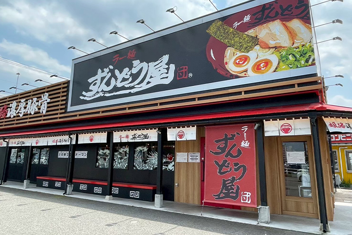 外観は赤と黒を基調としたデザインで、「ずんどう屋」の文字がインパクト大!