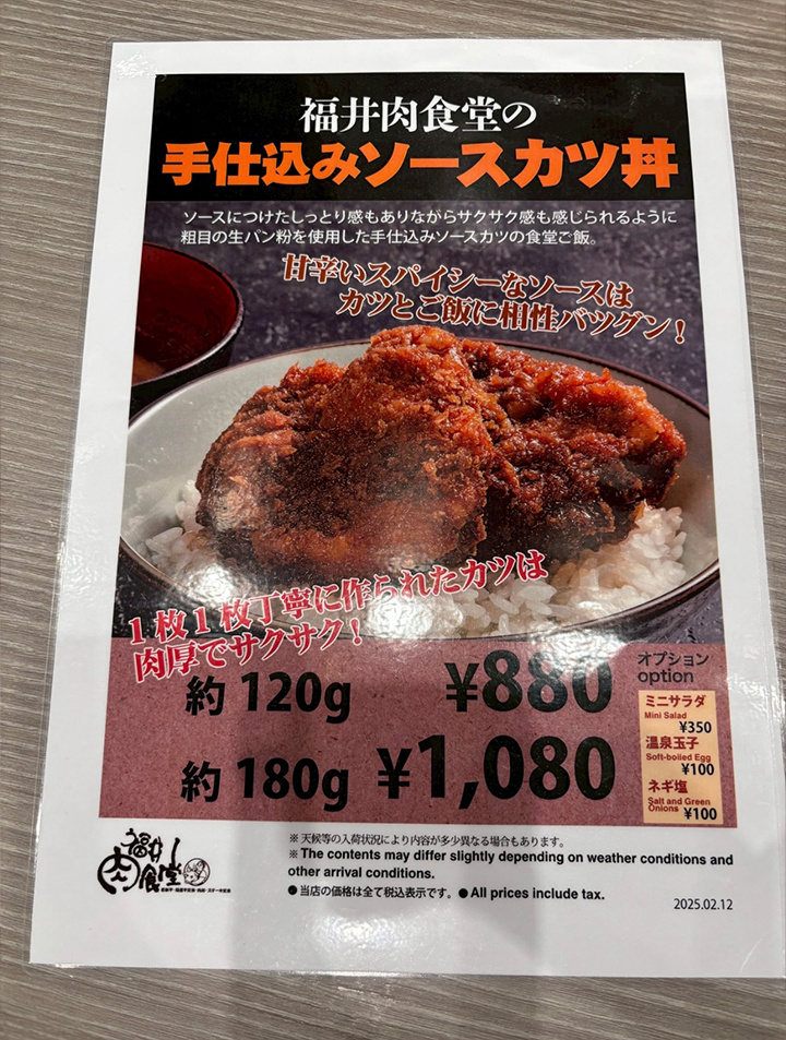 福井名物のソースカツ丼は120グラムで¥880、180グラムで¥1,080とリーズナブルです。
