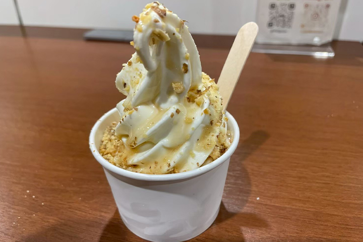 ソフトクリームの上にはメープルシロップとクルミがトッピングされていて、ソフトクリームの濃厚なコクと香ばしいクルミが相性抜群!