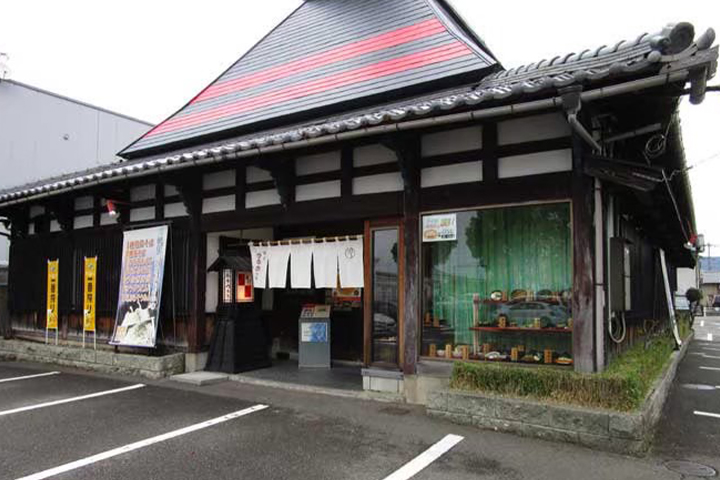 黒い屋根に白い暖簾がかかった建物が目印です。