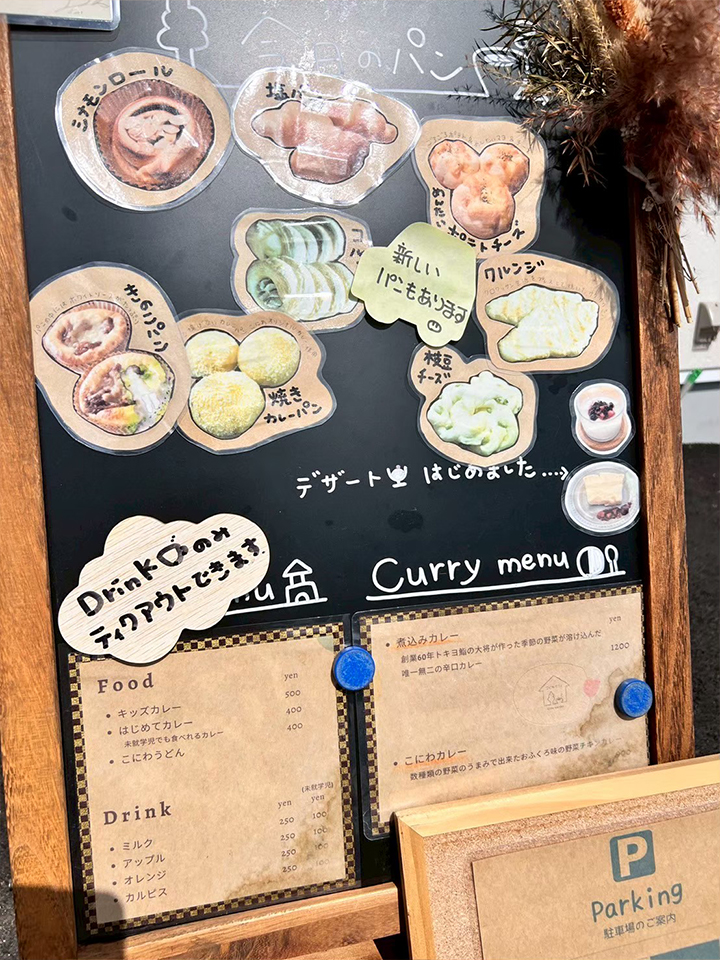 入口前の看板にはこの日のパンのメニューが書かれていましたが、この日は土曜日の15時過ぎだったこともあり2つしか残っていませんでした。