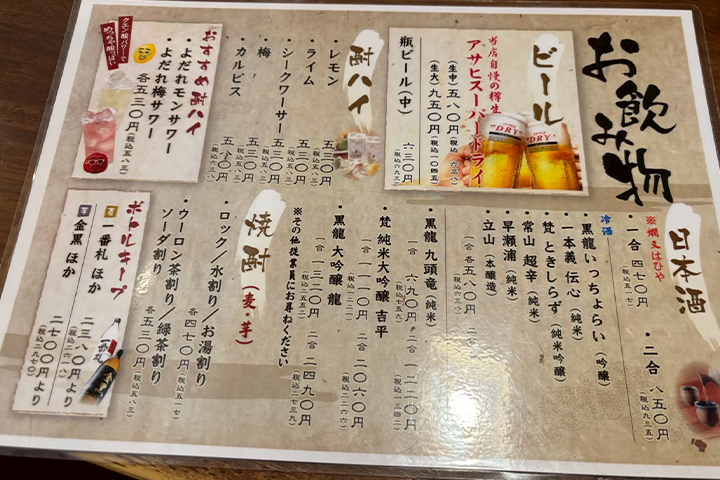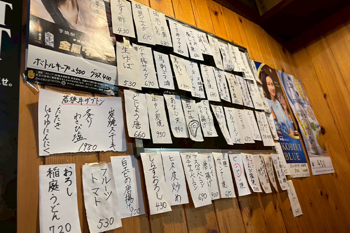 テーブル席の壁面に手書きでメニューの書かれた紙が一枚一枚貼ってあるのもなんだか風情があって素敵です。