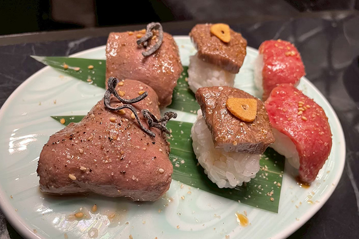 炙り肉寿司は3種盛られていて、どれも肉汁が白米とマッチ。