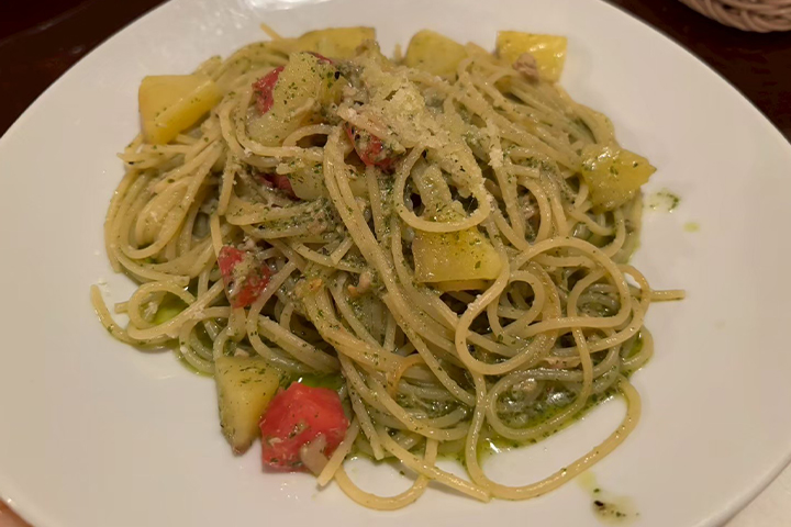 ジャガイモとツナのバジリコ風味のパスタはジェノベーゼオイルがたっぷりかけられていて、細めな繊細なパスタに良く絡みます。