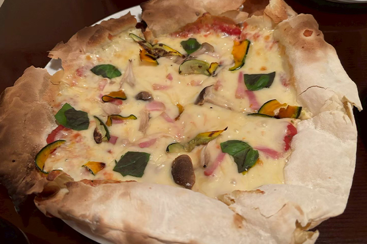 カプリチョーザのピザは生地がパリパリの薄いタイプ。上に乗った具が贅沢で、持ち上げるのに一苦労するほど。