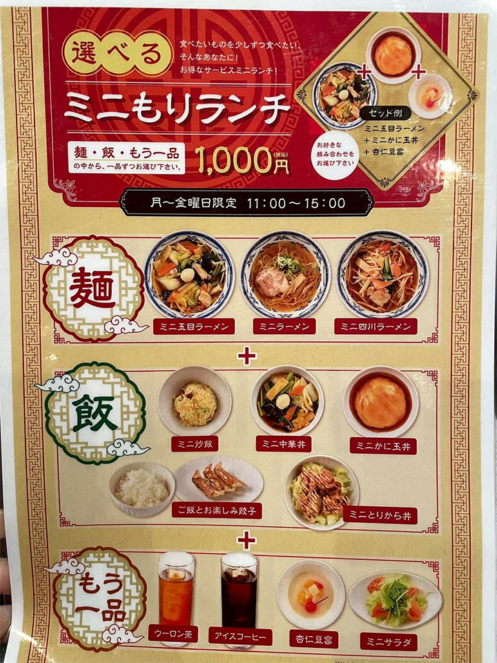 ランチタイムに人気の「選べるミニもりランチ」は、ラーメン・丼・サラダを自由に組み合わせられるお得なセットで、税込1,000円というリーズナブルさも嬉しいポイント。