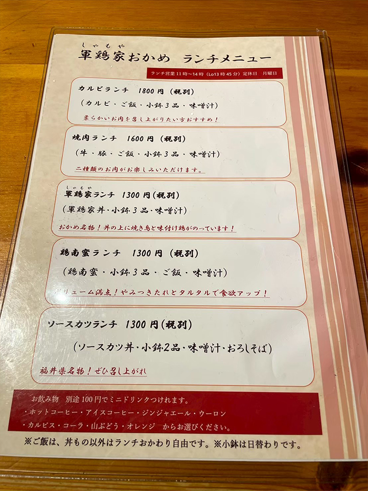ランチメニューは、鶏料理を中心に焼き鳥丼、鶏南蛮ランチ、焼肉ランチなどバリエーション豊富。