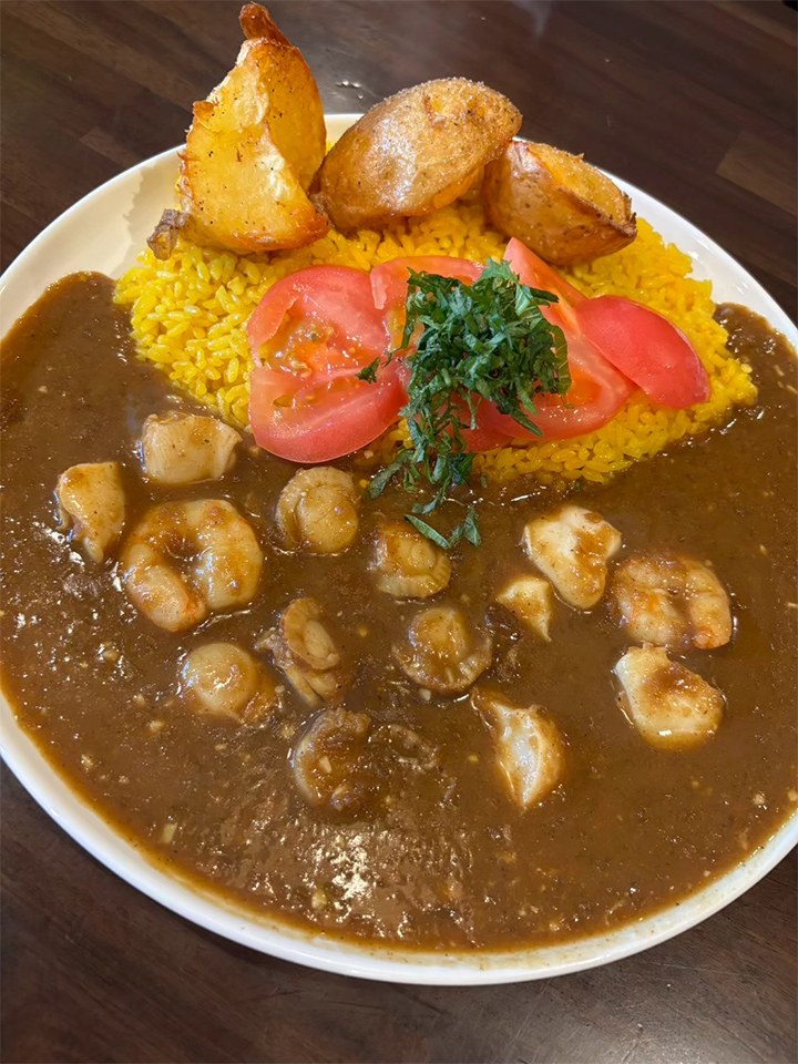 ・期間限定の海でトマトカレーにフライポテトいも!をトッピングしたもの(普通盛り、中辛)