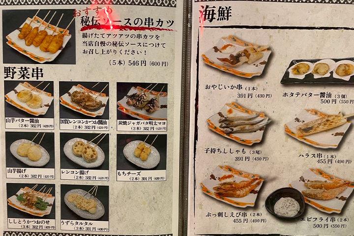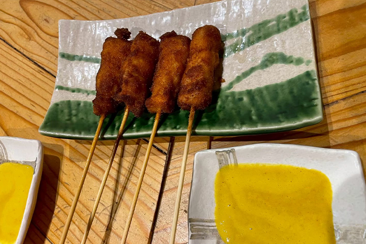 次にいただいたおすすめメニューの「秘伝ソースの串カツ」。自分でソースにつけるシステムです。