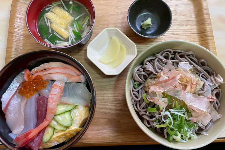 海鮮丼セットには味噌汁・漬け物が付き、さらに「おろしそば」か「ざるそば」を選べるのが嬉しいポイント!
