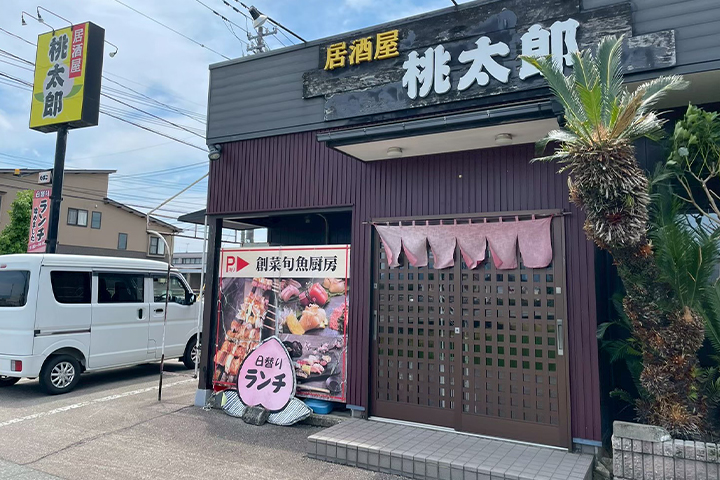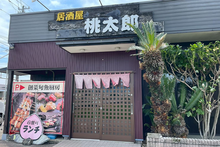 『居酒屋 桃太郎』は落ち着いた和の雰囲気が漂う外観で、親しみやすい雰囲気。