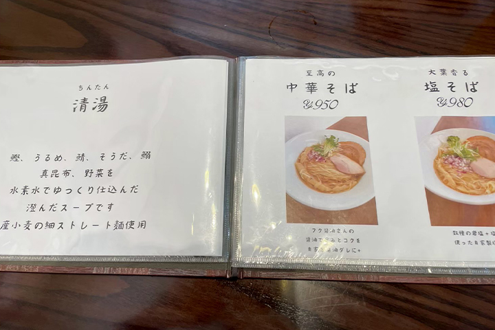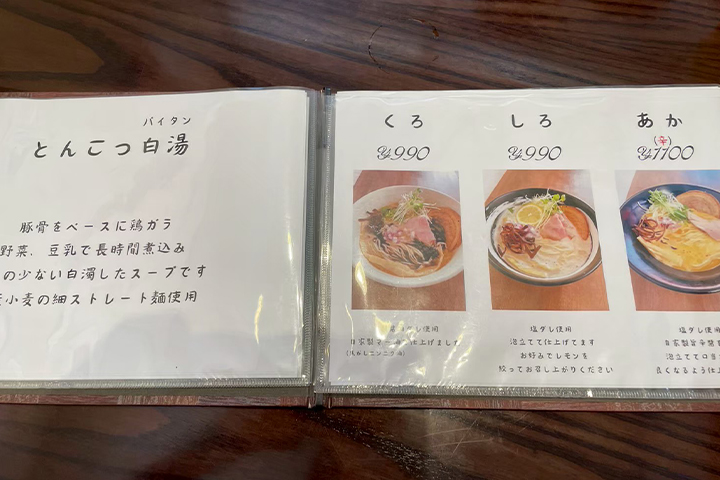メニューは鰹、鯖、昆布、野菜などを水素水でゆっくり仕込み、澄んだスープが特徴の「清湯(ちんたん)」や「とんこつ白湯」、「味噌」など、バリエーション豊かなラインナップ。