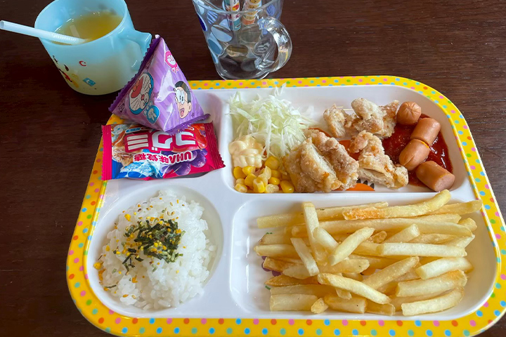 唐揚げやポテトなど、子どもが好きなメニューが盛りだくさん!ジュースやお菓子もついてきてボリューム満点の内容でした⭐