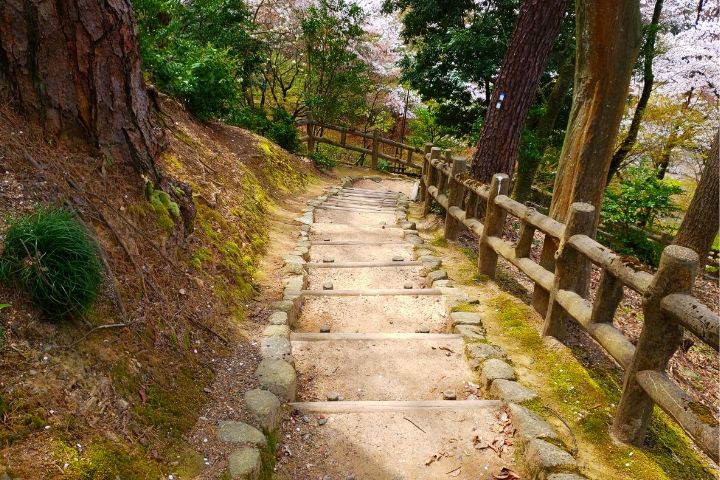下りの階段はあまりしっかり舗装されておらず木に囲まれて木漏れ日が気持ちいい素敵な空間ですが、足場が悪かったり段差が高かったりするので注意して下りましょう。