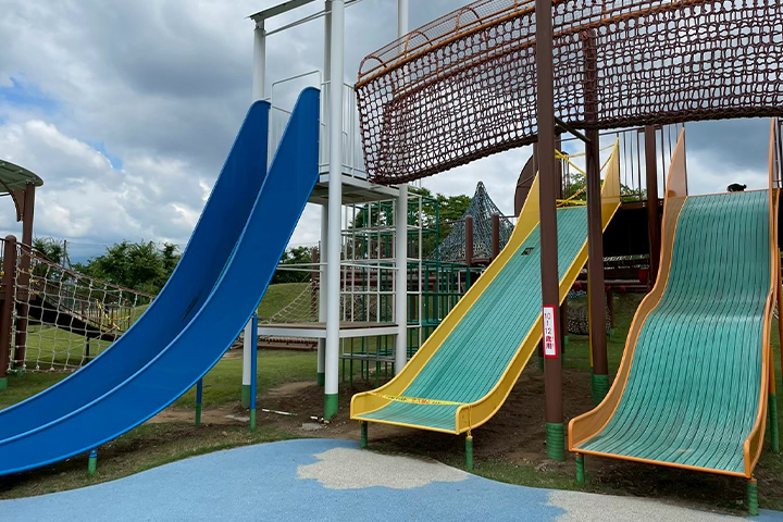 大型の複合遊具は、すべり台、トンネル、ロープ、吊り橋など、アスレチック感満載!